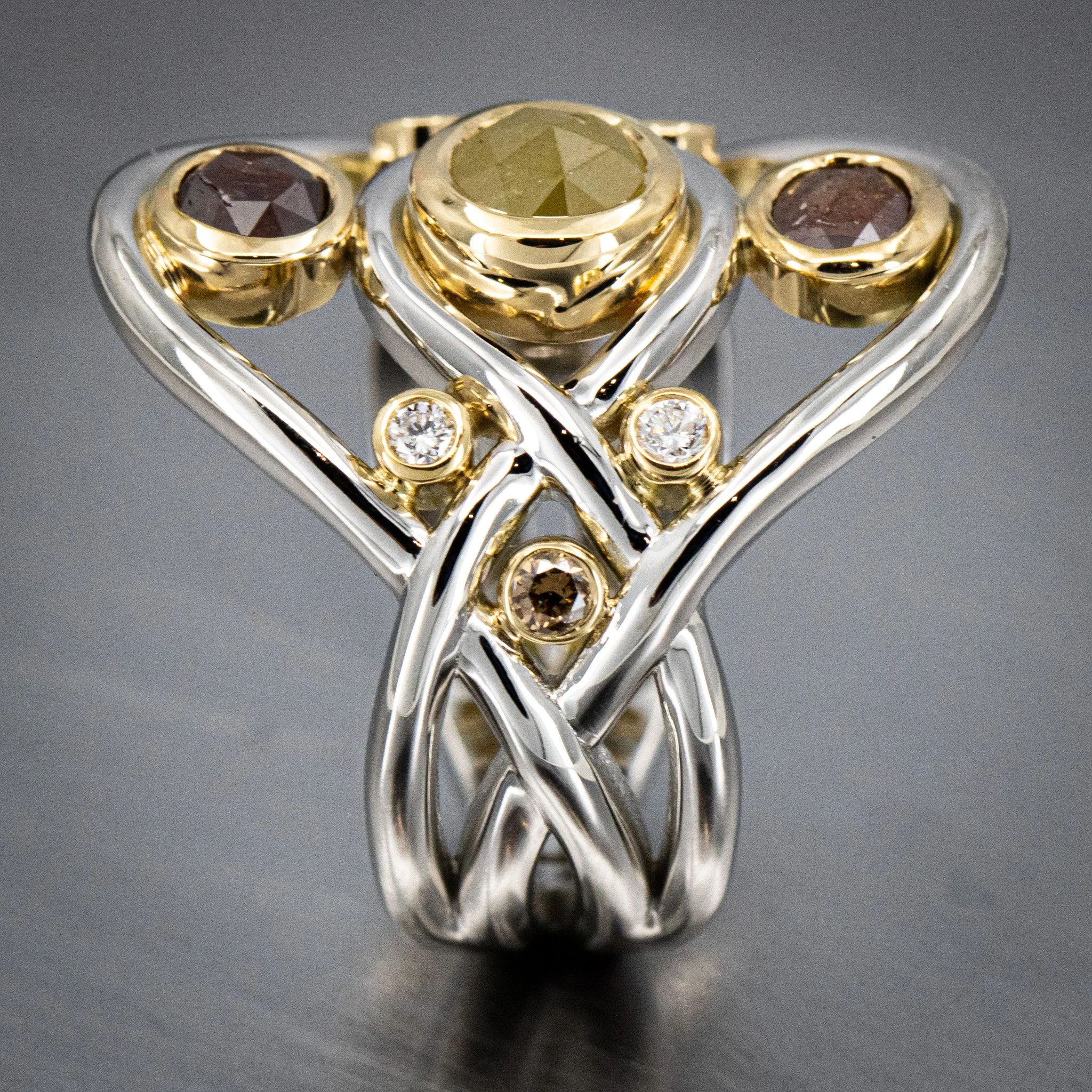 A two-toned design in platinum and 18K yellow gold, this ring features rose-cut colored diamonds bezel-set within an interwoven structure. Accented with round white and cognac diamonds for added contrast and depth.