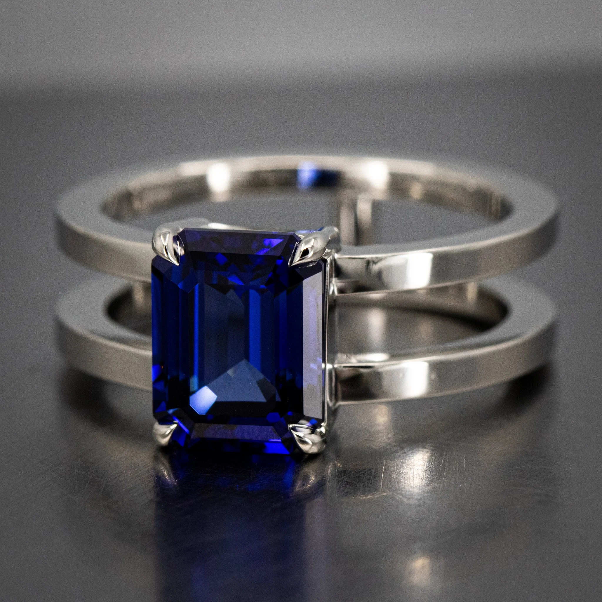 Gallery › Image 1 of 4 Image 2 of 4 Image 3 of 4 Image 4 of 4 $0.00 Sold Out Platinum emerald cut blue lab sapphire claw prong set on a symmetrical double band open center design Sold Out Added! Platinum emerald cut blue lab sapphire claw prong set on a symmetrical double band open center design